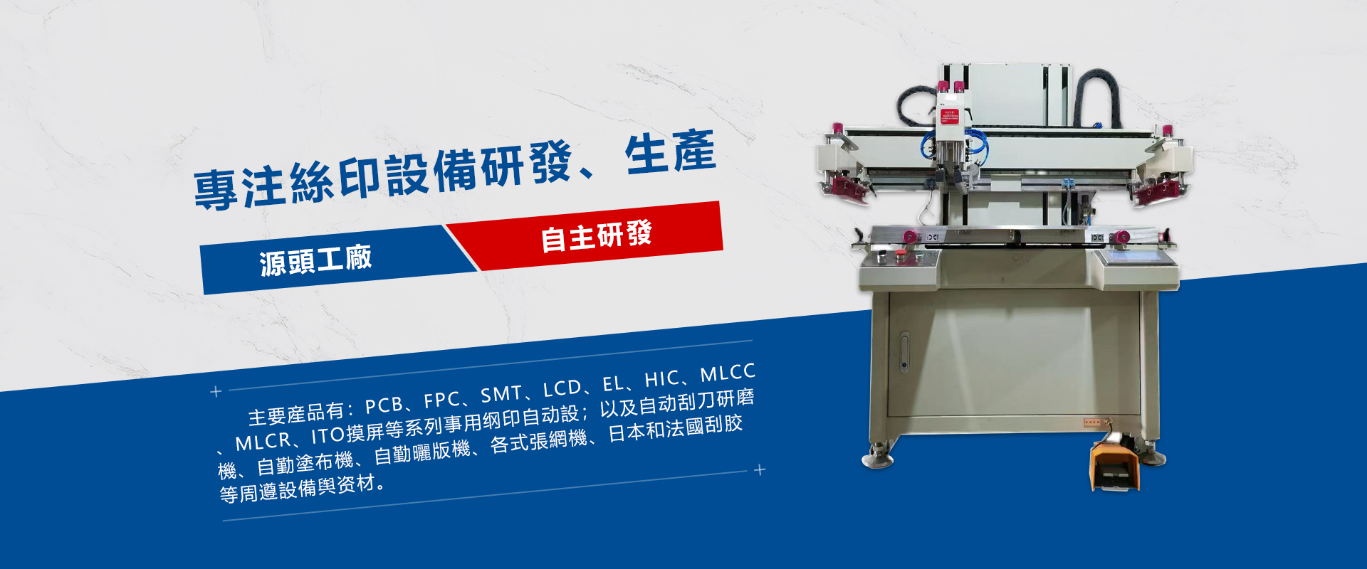 東莞市龍輝大正絲印設備有限公司創始人是從事絲印設備製造行業二十多年的專家,公司以先進的技術理念及精良設計,為絲印行業打造專用設備,主要產品有:PCB、FPC、SMT、LCD、EL、HIC、MLCC、MLCR等網印自動設備,及自動刮刀研磨機,自動塗布機、自動曬版機、各式張網機、日本和法國刮膠等周邊設備與資材。 本公司秉承“質量為本,顧客至上”的經營理念,堅持“客戶第一”的原則為廣大客戶提供精良的設備及優質的售後服務。您助“龍輝大正”成長,“龍輝大正”祝您事業輝煌!希望您能選擇龍輝大正的產品,讓我司成為您忠實的夥伴及朋友!歡迎惠顧!...